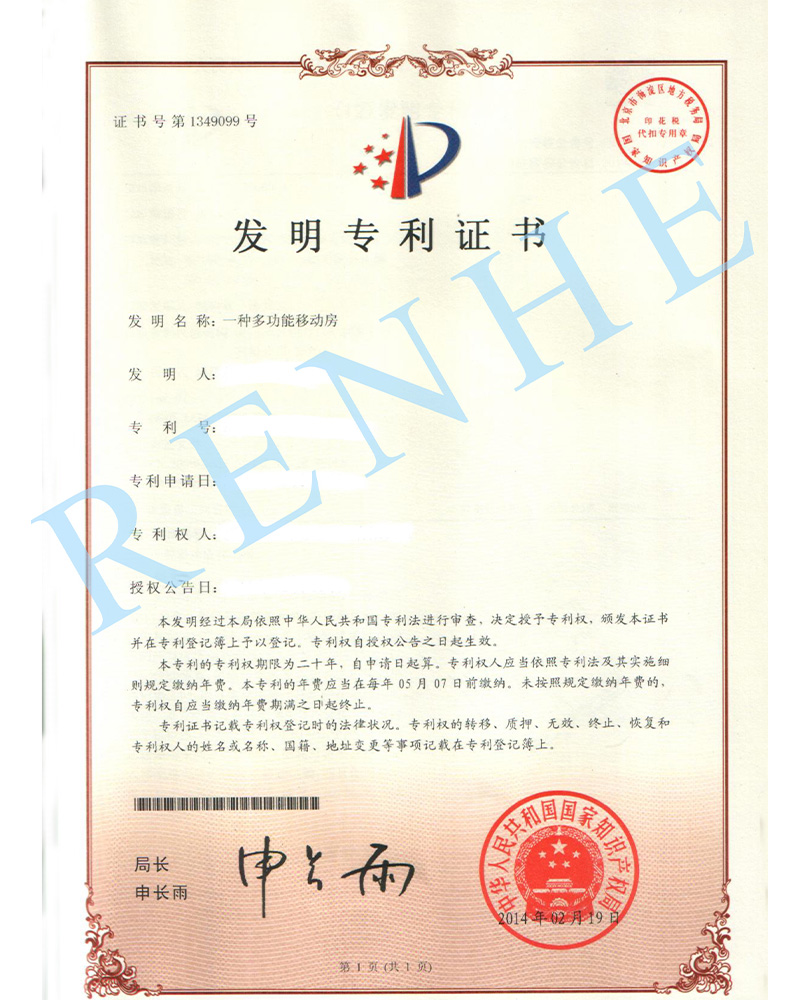 一種多功能移動房發(fā)明專利證書