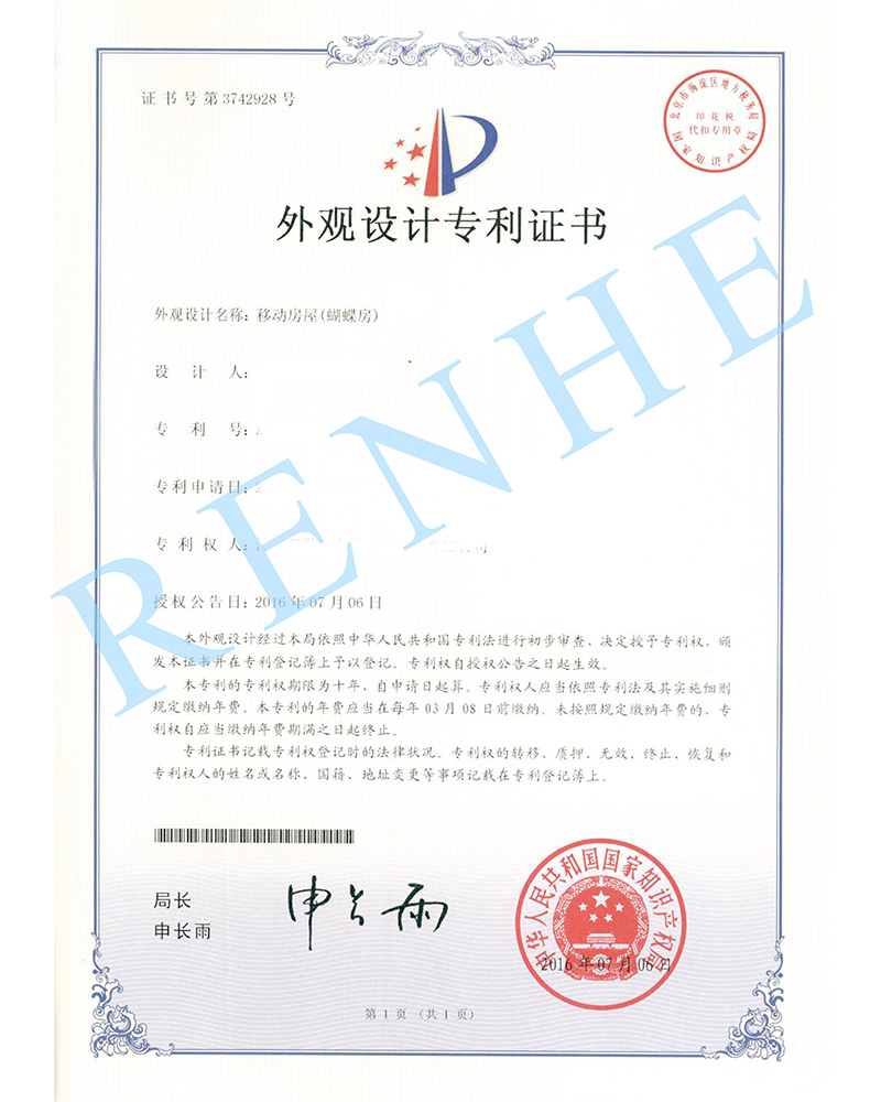 移動房屋(蝴蝶房)外觀設(shè)計專利證書